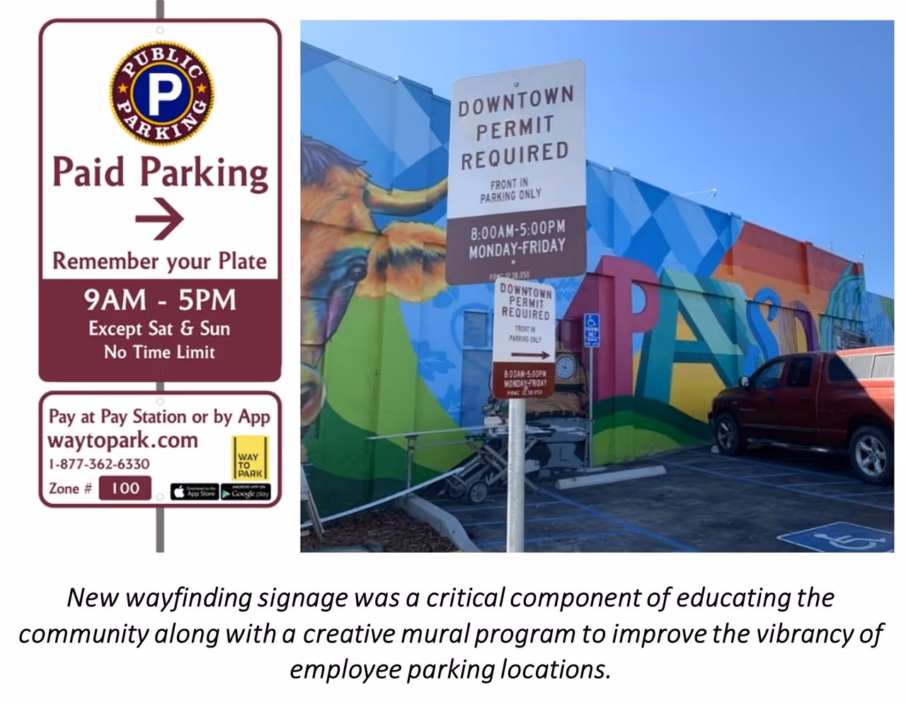 The Paso Robles Police Department created its first-ever Parking Ambassador position to directly support the implementation and enforcement of the pilot program along with a vehicle for license plate recognition (LPR), while Public Works prepared the City-owned parking lots for signage and lighting improvements.